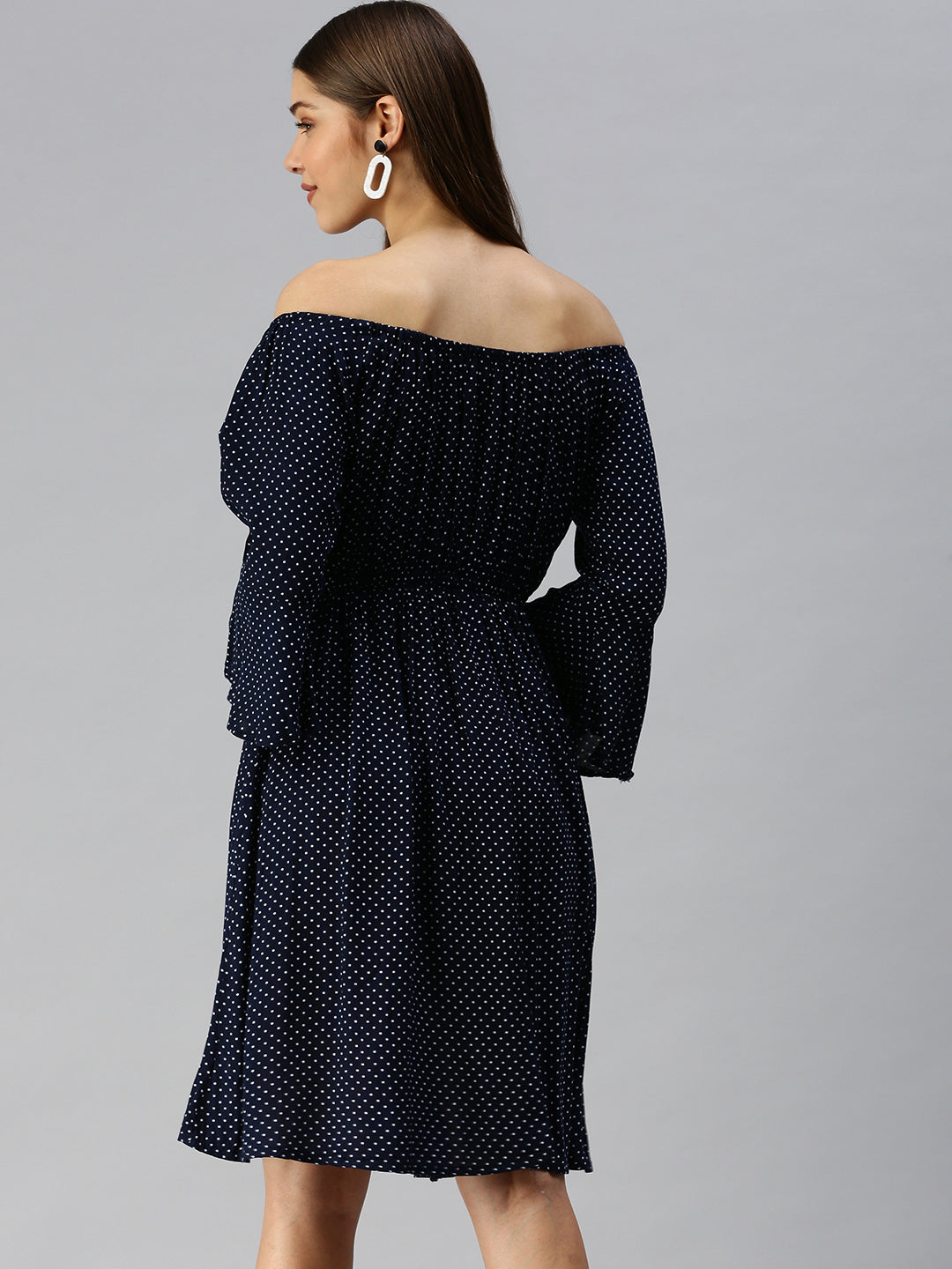 Women's Navy Blue Off-Shoulder Polka Dots Printed A-Line Dress